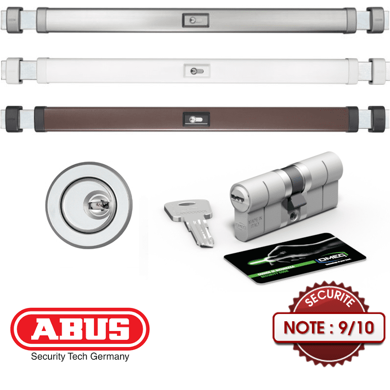 La barre est livrée avec un cylindre OMEC, 5 clés et la carte de propriété. Ce cylindre avec fonction débrayable vous permet d’ouvrir la porte même si une clé est introduite de l’autre côté. Vous pouvez donc laisser en permanence la clé à l’intérieur sur la barre horizontale. Avec des clés sécurisées, vous vous assurez un contrôle sur la reproduction des clés. Si vous deviez prêter votre clé à quelqu’un, il ne pourrait pas faire une copie à votre insu